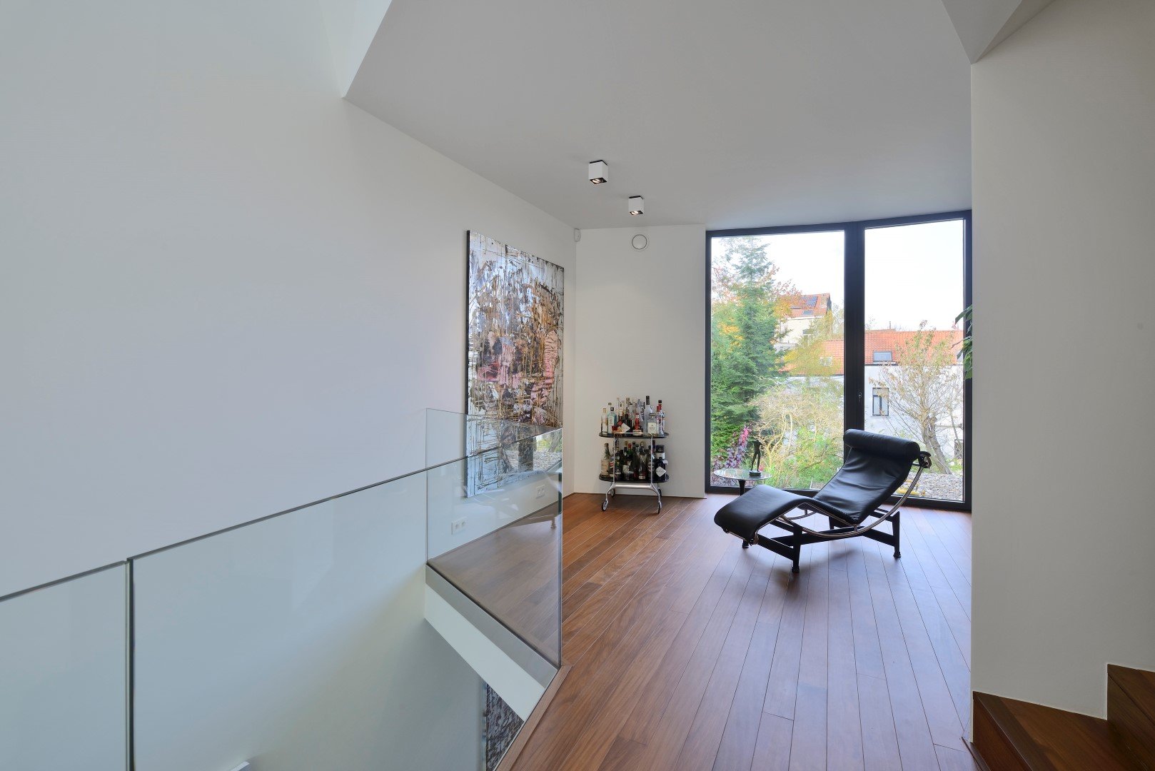 The project fits in the tradition of the traditional Brussels houses through the position of the secondary spaces, which are lined up along the adjacent house. However, it distinguishes itself by the treatment of the light. Indeed, the narrowness of the plot and the depth of the house led to the creation of an interior volume sculpted by oblique lines that broaden the living spaces. The void created in this way is used to channel natural light from the roof towards the different floors, through the centre of the house.